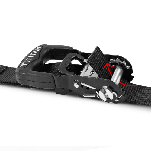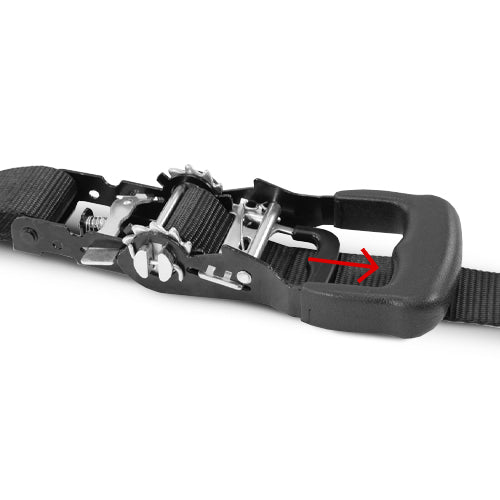 Tighten by ratcheting the handle back and forth. Make sure there is a minimum of 2 full wraps of webbing around the reel when finished. Lock the ratchet by leaving the handle in the closed position.