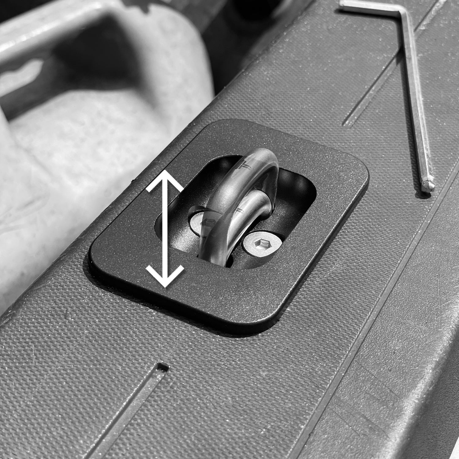 Pull upward on D-ring and insert bolts. Hand tighten with supplied hex key, give the bolts a final 1/4 turn to secure. (Do not over-tighten and do not use power tools)